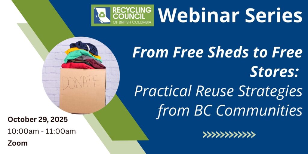 Register below and join us for this first session focussing on practical and innovative reuse solutions. From free sheds to free stores, local governments and organizations are working to make reuse happen in their communities. We’ll dig into what’s working, and share insights and opportunities to help make reuse a reality for residents across BC.